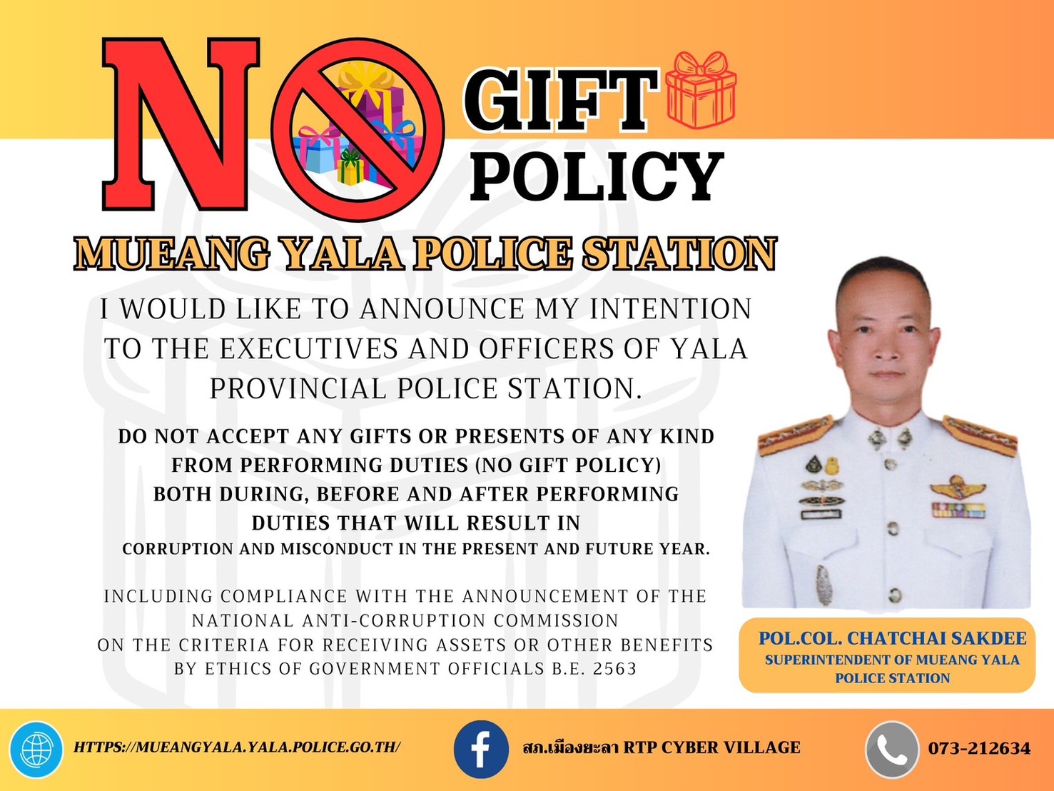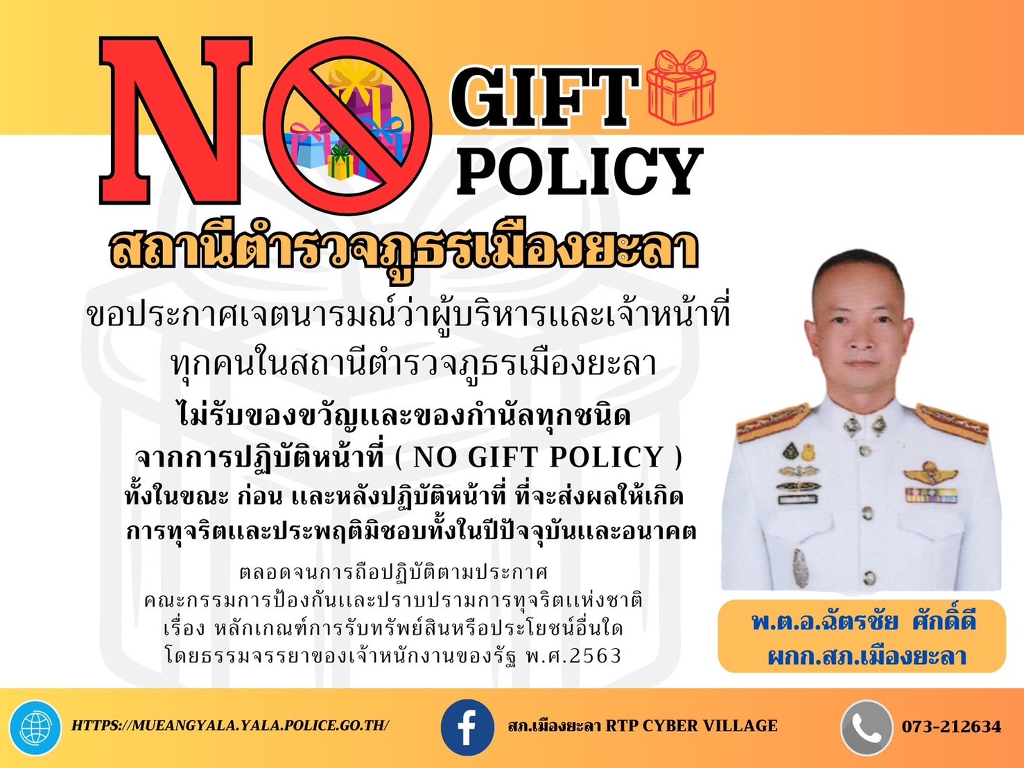 - ประกาศสำนักงานยุทธศาสตร์ตำรวจเรื่องเจตนารมณ์ที่จะไม่รับของขวัญหรือของกำนัลทุกชนิดจากการปฏิบัติหน้าที่