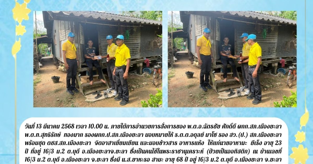 วันที่ 13 มีนาคม 2568 เวลา 10.00 น. 13 มีนาคม 2568 โดย admin / ข่าวกิจกรรม ภายใต้การอำนวยการสั่งการของ พ.ต.อ.ฉัตรชัย ศักดิ์ดี ผกก.สภ.เมืองยะลา,พ.ต.ท.สุทธิรักษ์ ทองมาก รอง ผกก.ป.สภ.เมืองยะลา มอบหมายให้ ร.ต.ต.อดุลย์ มาโซ รอง สว.(ป.) สภ.เมืองยะลา พร้อมชุด ตชส.สภ.เมืองยะลา จิตอาสาเยี่ยมเยียน และมอบมอบข้าวสาร อาหารแห้ง ให้แก่นายอาหามะ ยีเร็ง อายุ 23 ปี ที่อยู่ 16/3 ม.2 ต.บุดี อ.เมืองยะลา จ.ยะลา ซึ่งเป็นคนไข้ในพระราชานุเคราะห์ (ป่วยเป็นออทิสติก) ณ บ้านเลขที่ 16/3 ม.2 ต.บุดี อ.เมืองยะลา จ.ยะลา ซึ่งมี น.ส.ยาหะรอ สามะ อายุ 68 ปี อยู่ 16/3 ม.2 ต.บุดี อ.เมืองยะลา จ.ยะลา เป็นผู้ดูแล เพื่อเป็นการช่วยเหลือในการบรรเทาความเดือดร้อน และพัฒนาคุณภาพชีวิตความเป็นอยู่ที่ดีขึ้น ต่อไป FacebookFacebookXXLINELine
