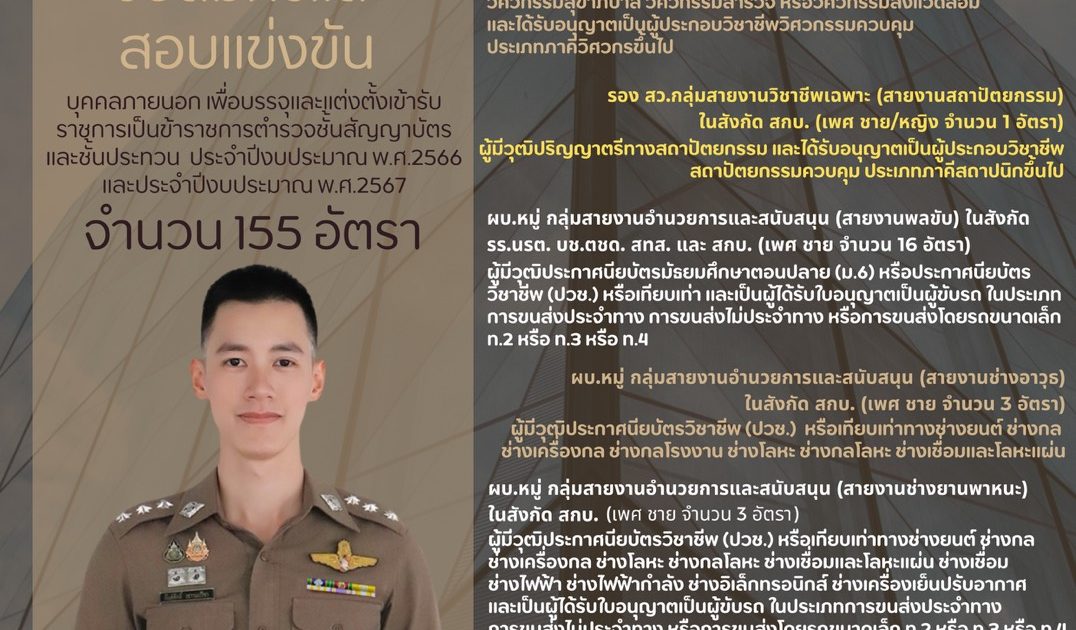 สำนักงานตำรวจแห่งชาติ เปิดรับสมัครและคัดเลือก/รับสมัครและสอบแข่งขัน บุคคลภายนอกเพื่อแต่งตั้งและบรรจุเป็นข้าราชการตำรวจชั้นสัญญาบัตรและชั้นประทวน จำนวน 155 อัตรา